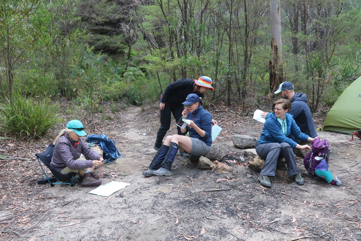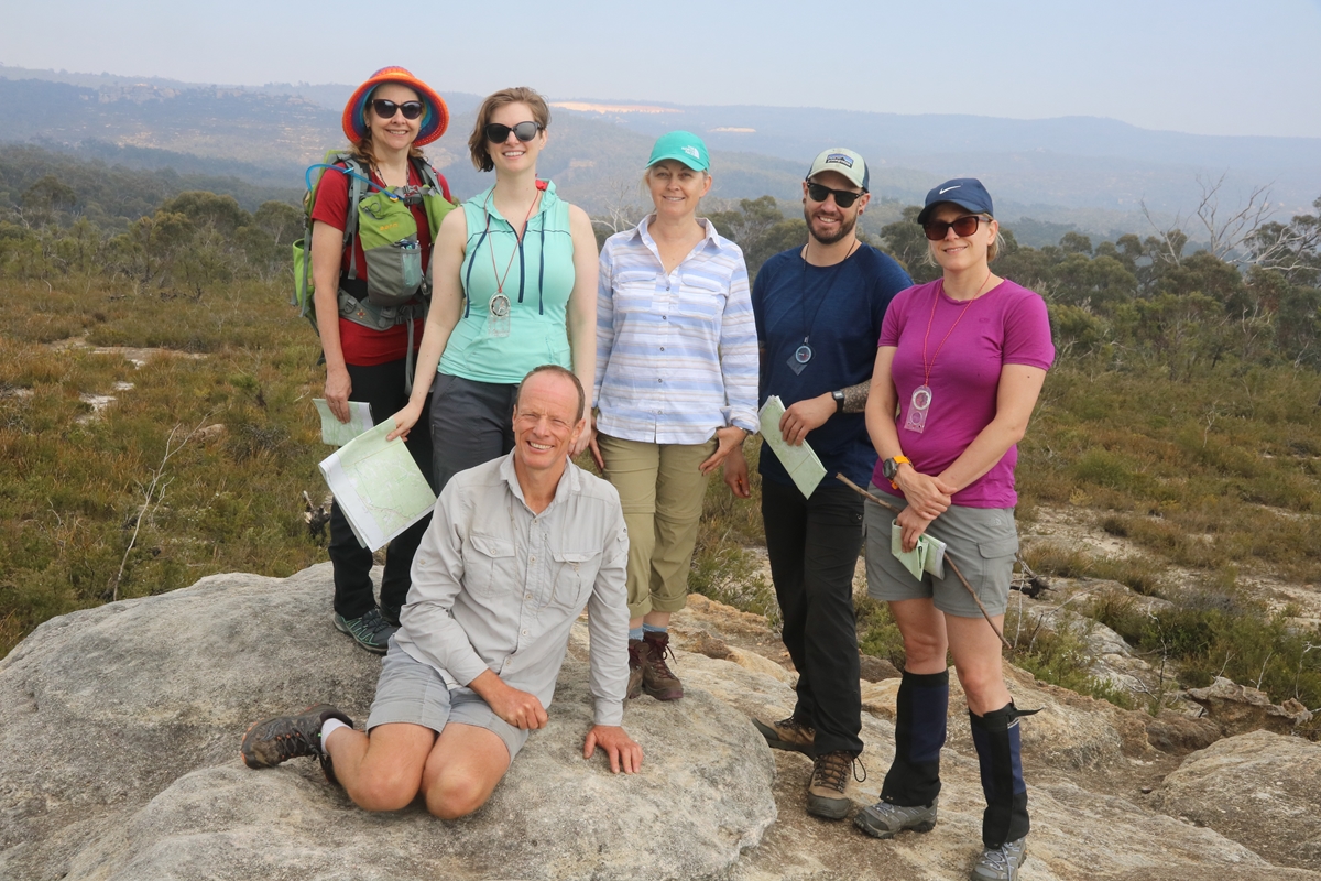 Here are some photos from the navigation weekend held on 30 Nov - 1 Dec 2019. A large bushfire was burning well to the north of the area we were hiking in and the area was very dry. The park was open with a park fire ban in place. Like much of eastern NSW, there was smoke haze. Due to the unusually high risk of fires we adapted the route so as to keep south of the Wollangambe River, thereby keeping ourselves close to safe and fast exit routes. Smoke and fires notwithstanding we had a great weekend out, with a full dose of navigation training being administered. Everyone got ample opportunity to practise the nav on marked and unmarked tracks and trails, and some scrub bashing thrown in. Our campsite was in a quiet sheltered glade with natural rock gardens nearby and a small stream with a few clear pools of clean water. On Sunday we did a short hike to a high viewpoint for some more navigation practise, but due to heavy smoke haze, we headed back to Bell by lunch time. The trip concluded at Bell for some, and at the Pie in the Sky cafe in Bilpin for others!