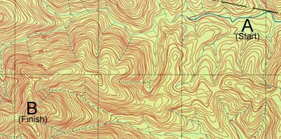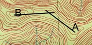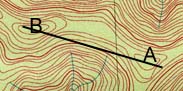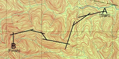 Notice that we have chosen a series of spurs and ridges as the landforms that we will follow to get from A to B. These landforms offer a series of natural features that connect A to B and thus by following these our task of navigation will be made much easier.