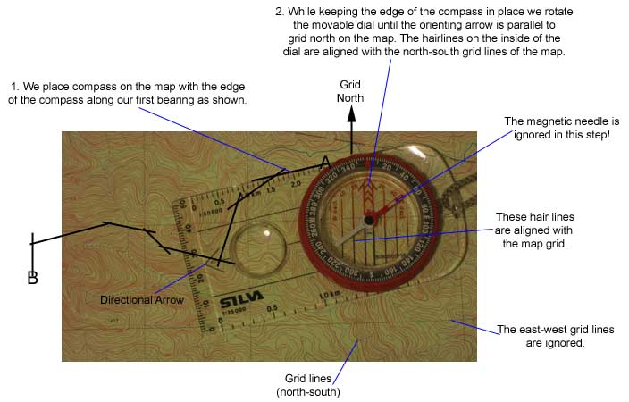 We are now going to work through the steps that you would use to accurately navigate your way from point A to B on the map in Figure 8.1 (above).