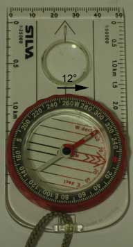 Remember from Section 6.1 that magnetic north is 12 degrees to the east of grid north. Our bearing of 257° that our compass is now set on is relative to grid north. That is, 257° is the angle between grid north and the direction we want to go in our example. Before we can use the compass to follow our bearing, we need to adjust for the difference between grid north and magnetic north. That is, we have to subtract 12° from our grid bearing. We do this by rotating the compass dial clockwise by 12°. You can take the compass away from the map to do this. The value of 12° is the difference between grid north and magnetic north in south eastern Australia. This value may be different in other parts of the world.