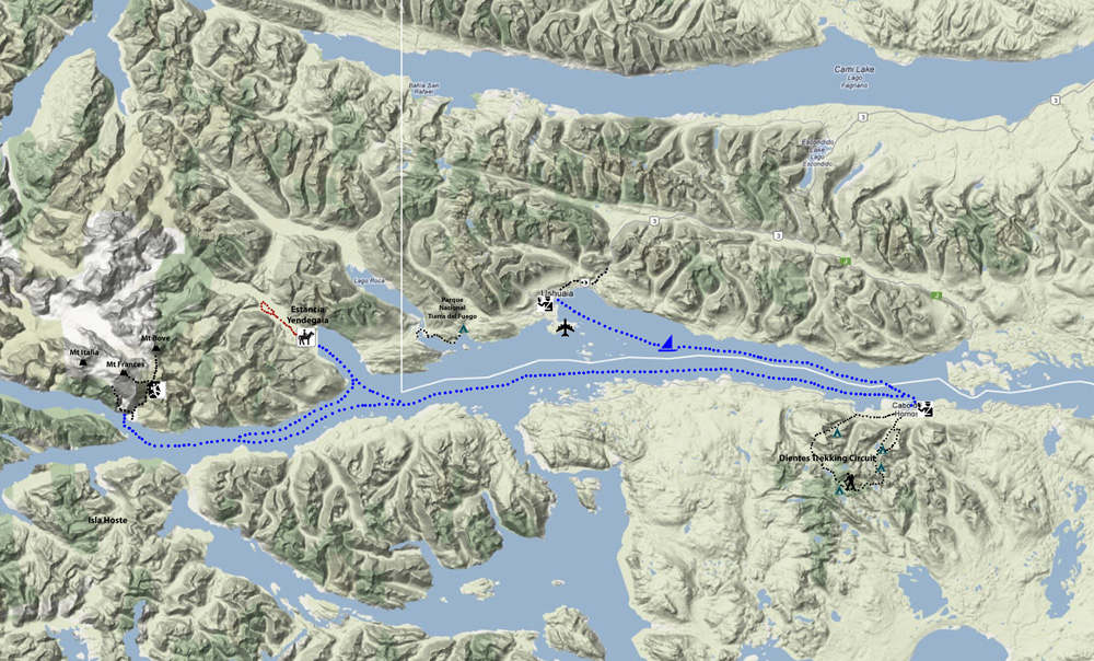 Map of our route up and down the Beagle Channnel