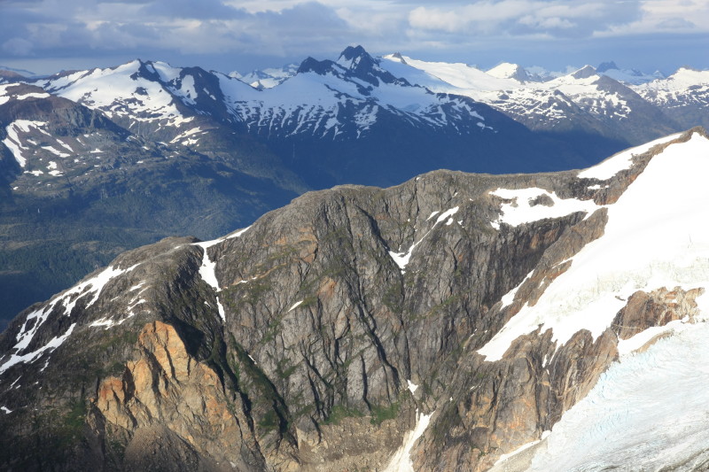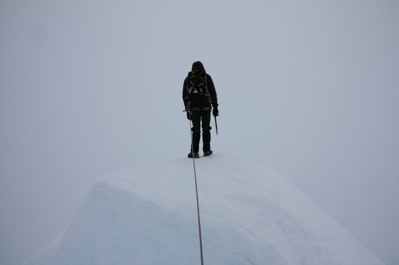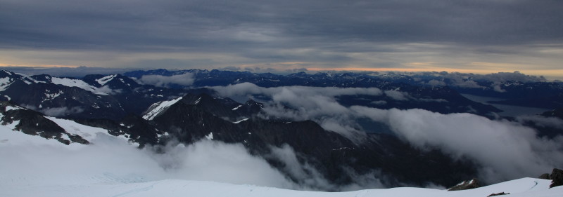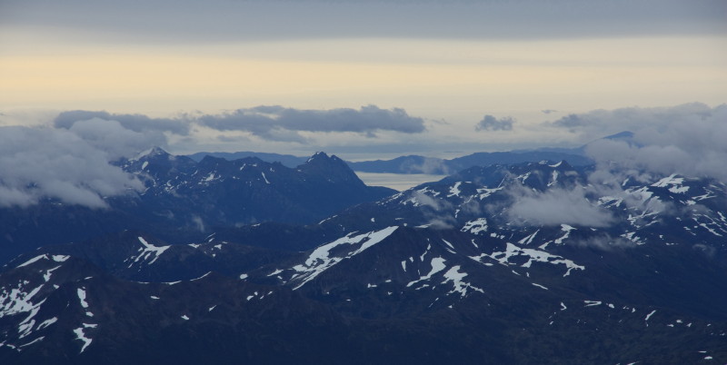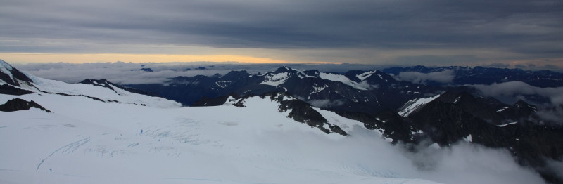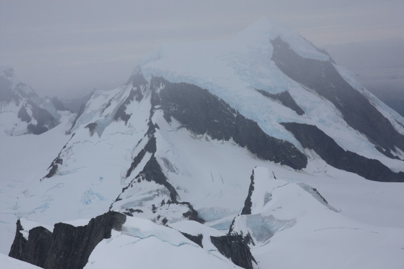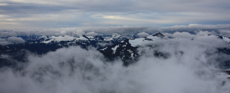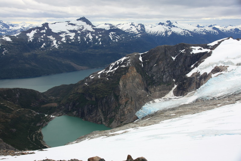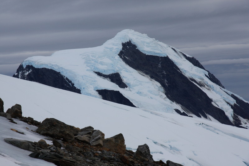 Grey peaks and grey clouds, marginal weather for climbing Monte Frances. |