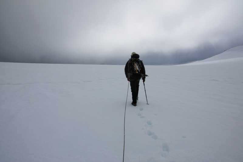 We reached this col with the open expanse of the ice plateau beyond, however the cloud came in again and visibility was zero so unfortunately we had to turn back. |