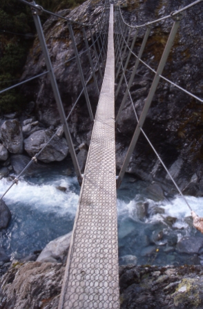 Near the head of the Matukituki Valley, the river is crossed by means of this swinging bridge. It is at least a 20m drop into the churning waters below. |