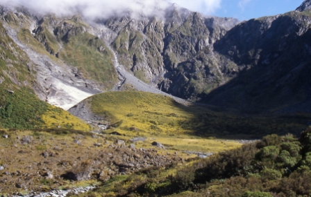 During the morning we reached the head of the Matukituki Valley. The route from here is straight ahead and up to the right, following the steep and narrow gorge above the waterfall at the very head of the valley. | |
