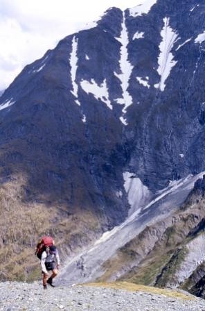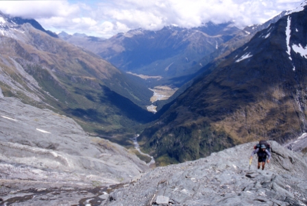 Greg Salway labours up the glacial morraine at the head of the valley. | |