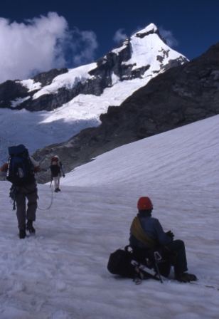Chris and Greg are roped up and climb on snow towards Bevan Col. | |