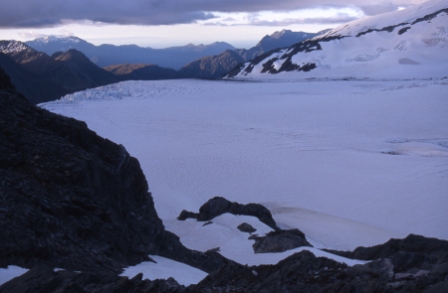 That evening, serene views out across the Bonar Glacier to the Tasman Sea beyond. Tomorrow we will cross this glacier and climb onto the ridge beyond, where Colin Todd hut will become our base camp for our summit attempt. | |
