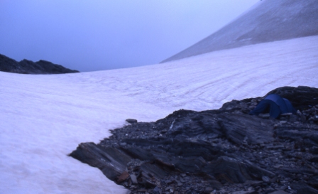 Here is my tent, nestled in among the rocks at Bevan Col. |