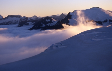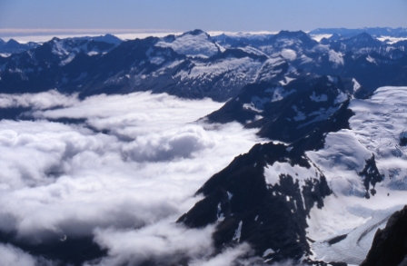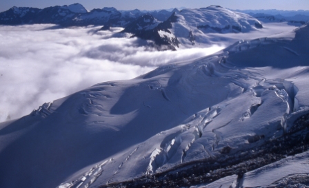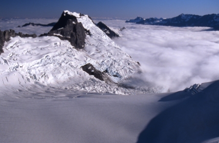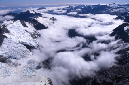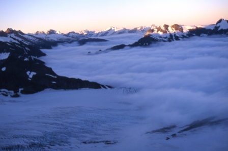 The Therma Glacier sucked down by gravity into the valley, that is still covered by mist. | |