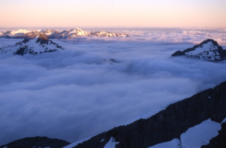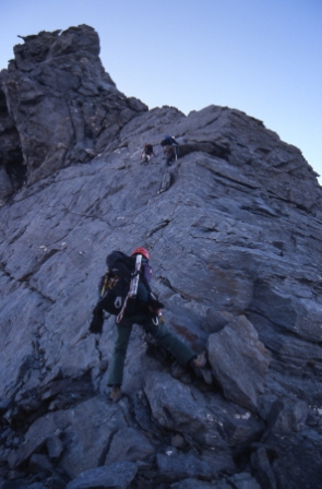 And the morning views revealed the huge vertical exposure of the ridge. Should the weather turn bad, things would get serious. However, as far as the eye could see the weather was perfect and the wind was from the south west, so we were confident that it would hold and that it was safe to go on. | |