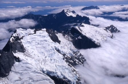 Rugged peaks, all below us now, and the Tasman Sea beyond. | |