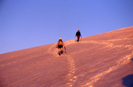 By the time we are off the Nort West Ridge it is getting late, and we descend the easy snow slope that links the north west ridge with Shipowner ridge. | |