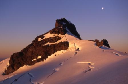 And finally, as we approach the hut, the moon rises, and the last light of the day catches the evening peaks. A fitting end to an incredible day out. |