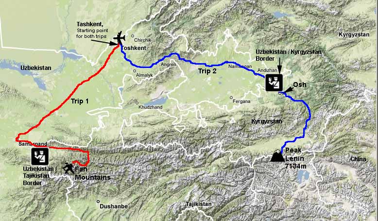 Map of Central Asia showing location of Fann Mountains and Peak Lenin. Routes travelled to reach each destination are shown, with locations of each international border crossing.