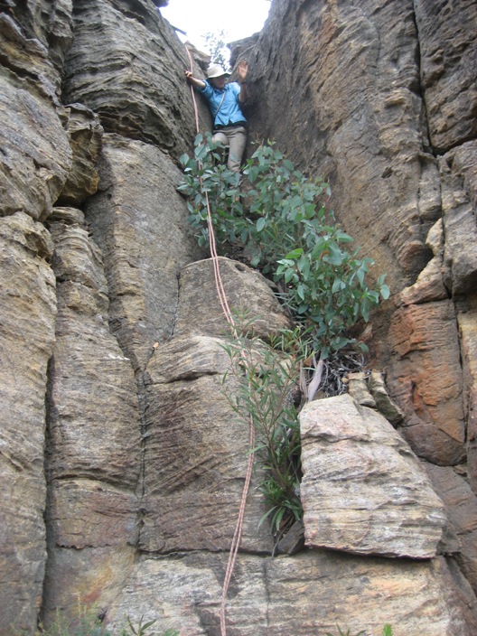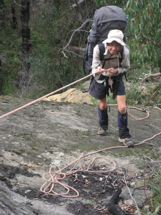 Kendy climbs up a steep slab. The rope was handy here because the rock was damp and therefore quite slippery. |