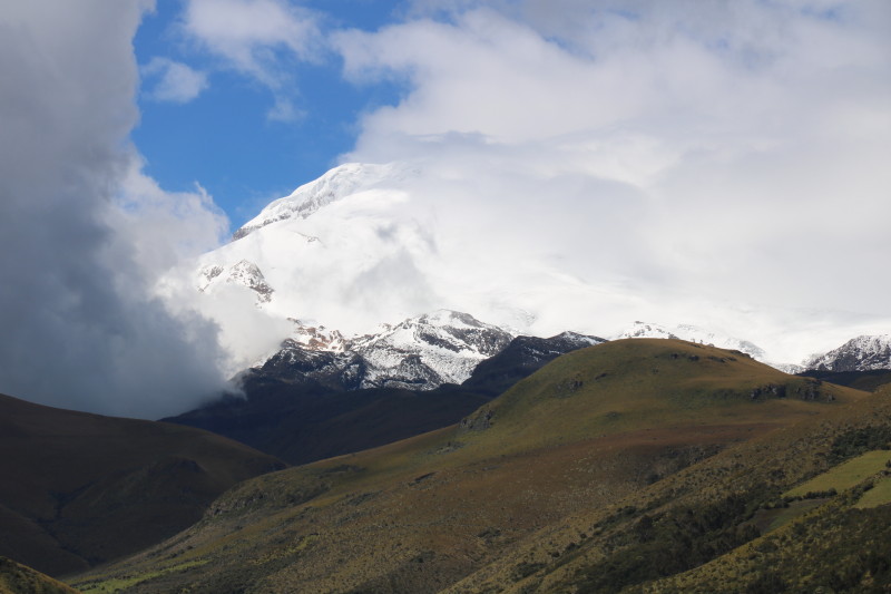 Cayambe is the third highest mountain in Ecuador at 5790m. It lies just north of the equator, such that the equator crosses the southern slopes of the mountain. These slopes of Cayambe are the highest points on the equator anywhere on the surface of the Earth. This peak was the last peak on my "Seven Summits of Ecuador" trip in 2015. Like many of the other summits, the weather on top was appalling. My guide and I were alone on this mountain. Although we got very close to the summit, we could not make the final steep ascent in the conditions that faced us. While we were on the mountain the weather worsened and snow fell to low elevations by equatorial standards, and the result was that the drive off the mountain was challenging and adventurous.