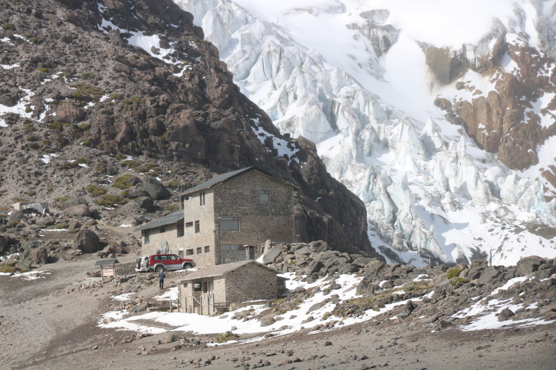 The drive from the village of Cayambe to the refugio high on the mountain was a beautiful journey up a steep cobbled farm road that became a rough bush track. Here was one of the loveliest subalpine environments I had seen so far in Ecuador. After climbing steeply in low range four wheel drive we reached alpine ground and the vehicle had to plough, slide and slew its way across snowdrifts to eventually reach the refugio perched on a ridgetop at 4650m. This was the most spectacularly situated refugio that I stayed in any of my seven summits of Ecuador. The weather was passable but cloudy and the mountain was not visible. The refugio was very homely and comfortable, and apart from the warden, we were the only occupants. Alarms were set for midnight.