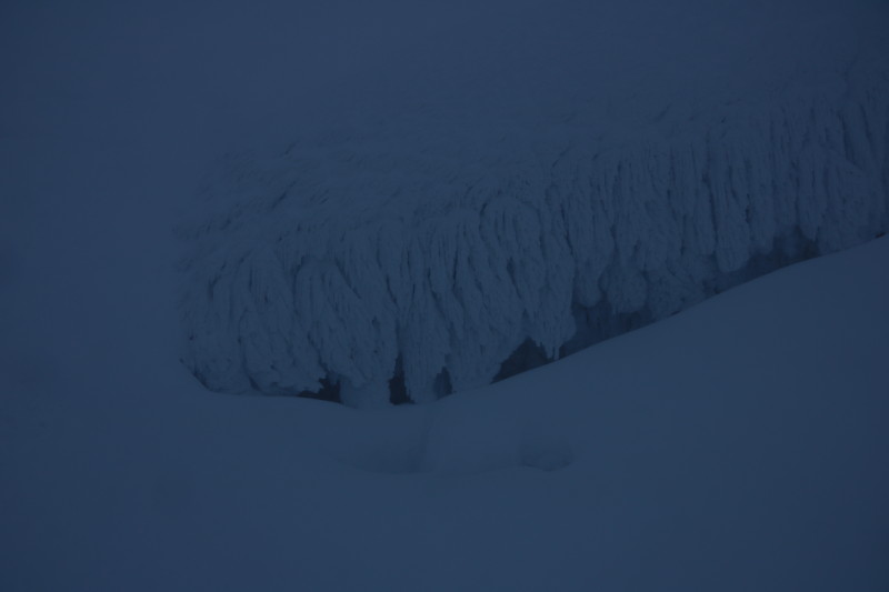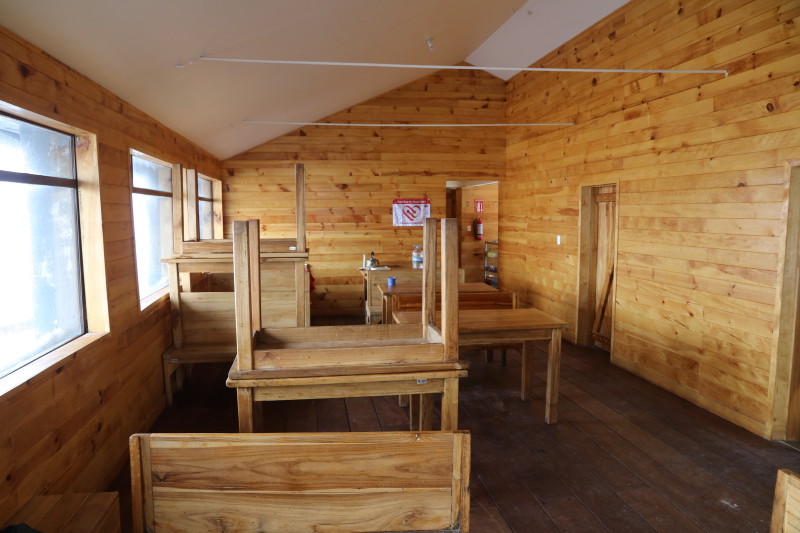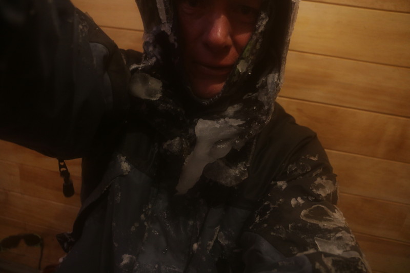 We turned back, and Abraham had placed flags at essential waypoints on the way up so we didn't get lost on the way down. The weather worsened and the last stage of the descent on the mixed ground was diabolical in atrocious weather that was very difficult to move in. The snow was falling to lower elevations now, down to around 4200m. We reached the refugio and it took some time to remove clothing and gear because it was so iced up.