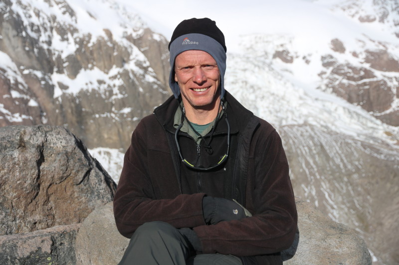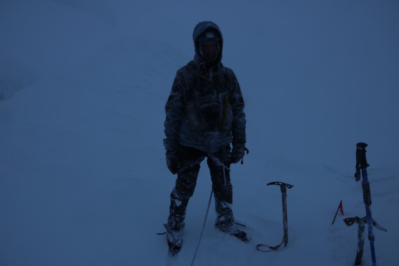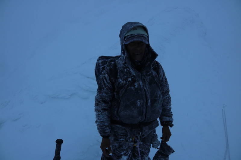 At midnight we got up and had a light breakfast, then at 01:10 we stepped outside. The conditions were bleak, snowing in whiteout with a wind blowing. We climbed on mixed ground until we reached the main glacier where we put on crampons. Fresh snow was everywhere and it was still snowing. We climbed, changing direction at times, Abraham seemed to know where he was going in the dark. After a long time climbing in the poor weather we reached a serac at 5700m. The snow was very deep and the weather was terrible so to complete the last steep 100m to the summit was not an option. We turned back here, satisfied that given the conditions we had done very well to get this far.