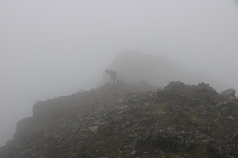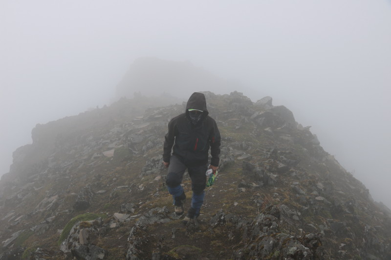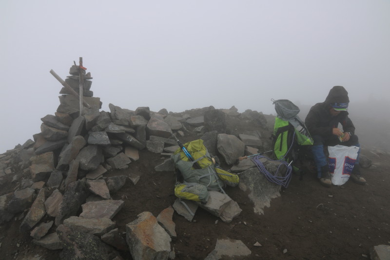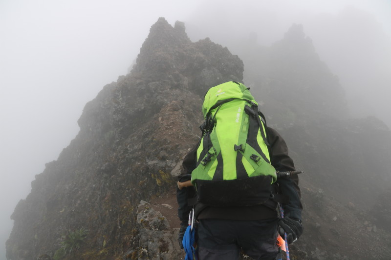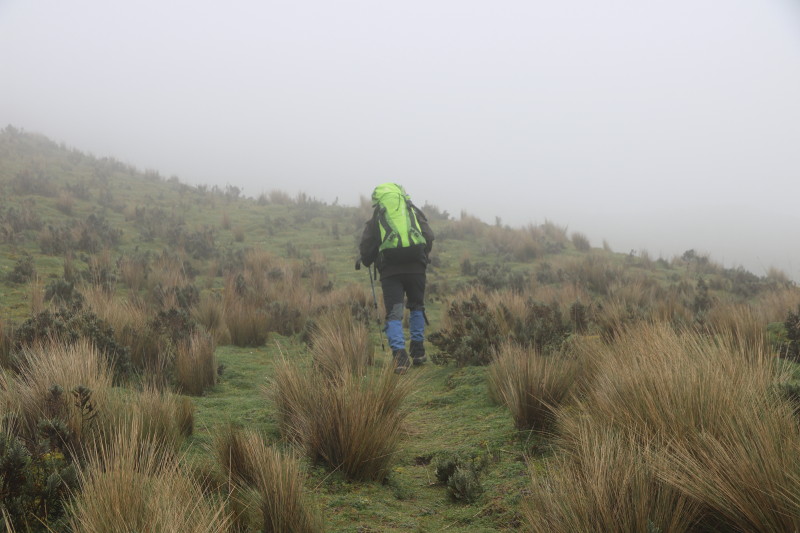 We climbed steadily among alpine grasslands to eventually reach the exposed summit ridge at about 4300m which was rocky and bare, now that we were above the vegetation line. I was breathless here as it was my first acclimatisation hike since arriving in Ecuador less than 48 hours before. From here it was a further 500m of ascending to the summit. The ridge was rocky and slippery and a few short sections were steep and exposed. My guide protected these sections with rope and I wore a harness and clipped into the rope for protection on these short, steep, slippery and exposed sections. The ridge kept climbing into the mist which was so dense we could only see the route ahead for about 50m. We reached the broad summit, spent a little while there to take our summit photos and to eat and drink a little before retracing our steps back to the waiting vehicle and driver. Then it was back to the comforts of my hostal in Quito to conclude a good day out.