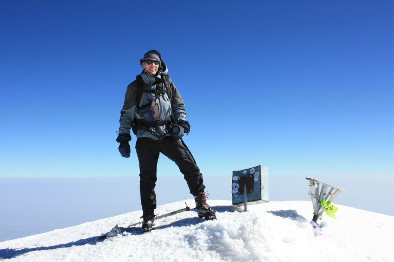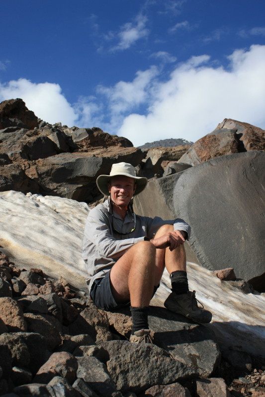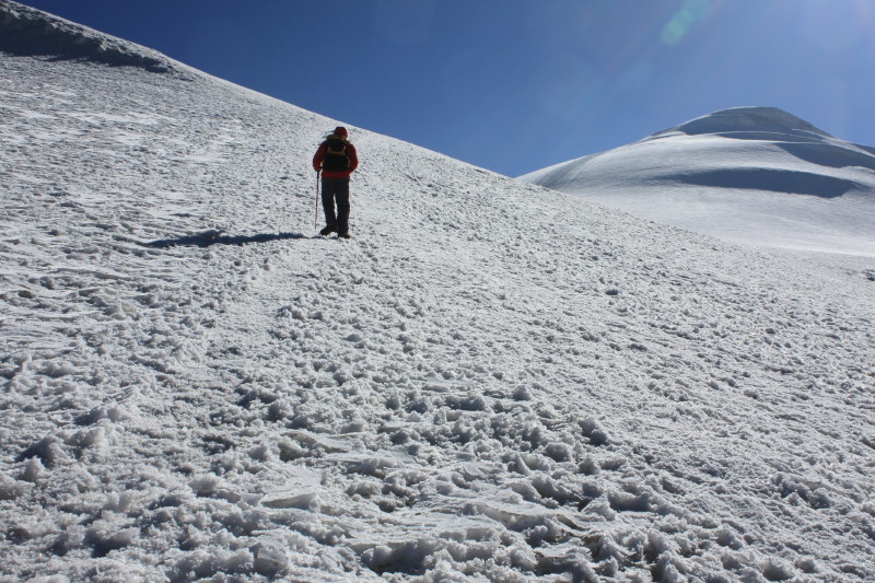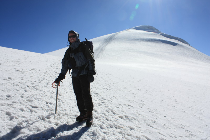 On 21 August alarms went off at 1:30am and breakfast was at 2am. At about 2:30am we set off, in complete darkness, our torches lighting the way up the rocky slopes. By the time the sun came up we had reached the permanent snow cap at an altitude of about 4800m. Then it was a matter of cramponing up the gentle snow slopes to the summit. It was very cold and windy on top!