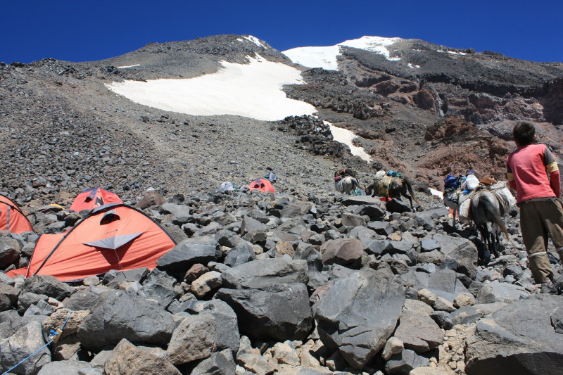 On 20 August I wasn't feelin very well, something wrong with the food. But the food was so nice! We climbed to Camp 2, reaching it by about 11:30am and feeling quite lethargic due to the effects of altitude. Later, horses arrived at the camp with our luggage. Most of the afternoon was spent resting, and this was followed by a short acclimatization walk. Then it was dinner and early to bed - our summit bid would start at 2am the following morning.