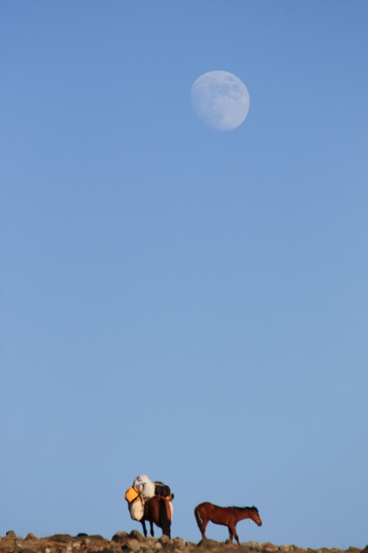 In this vast landscape of lava flows and volcanic peaks and rising moon you have the impression of being on but one of several planets in the solar system .... Am I on Mars? No, there are horses! |