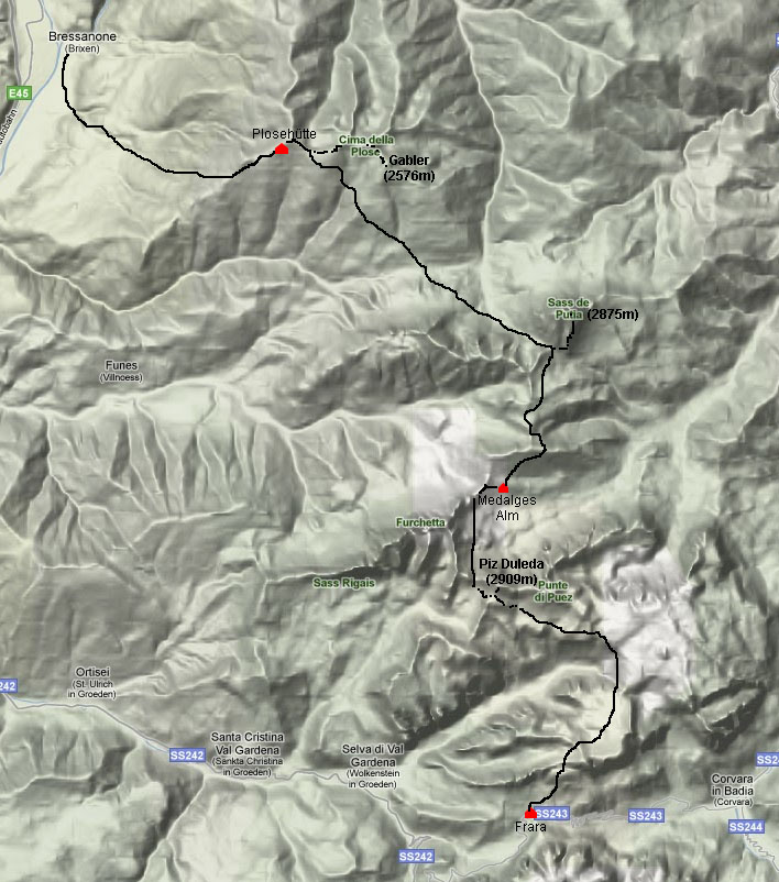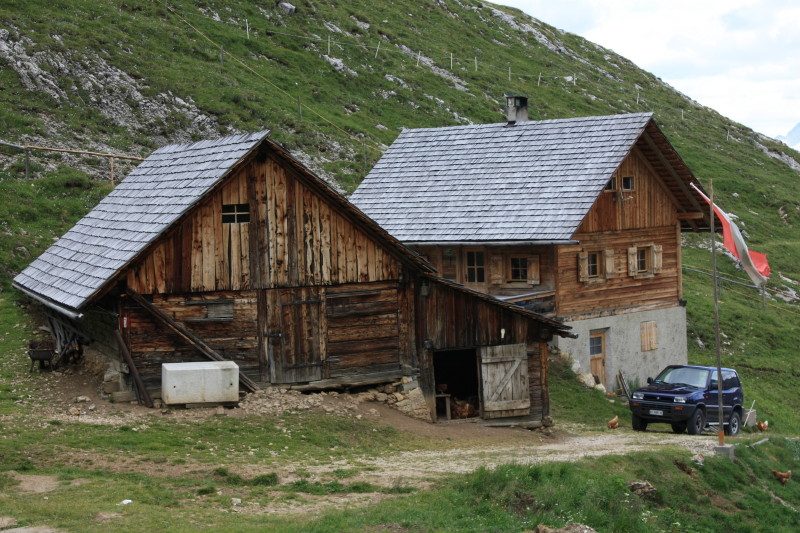 | 25 Jul 2010 | A clear cold day, followed the AV2 to Forcella de Putia. Side trip to climb Sass de Putia (2875m) which had a small section of via ferrate choked with crowds of people. Went to Rifugio Genova and then beyond to the farmhouse of Medalges Alm. Here accommodation in the barn roof was available so we stayed there. |