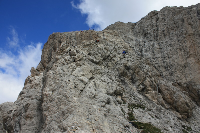 | 26 Jul 2010 | An excellent day of walking in fine weather. Climbed to Forcella della Roa and then took the variant route 3A which took us up a via ferrata to near Forcella Nives and then to the summit of Piz Duleda (2909m). This was spectacular and rewarding walking. Then it was very scenic walking in fine weather over a high limestone plateau and other minor passes to finally reach Grödner Joch. There we stayed in Frara, a hotel style dormitory with proper restaurant, showers etc. |