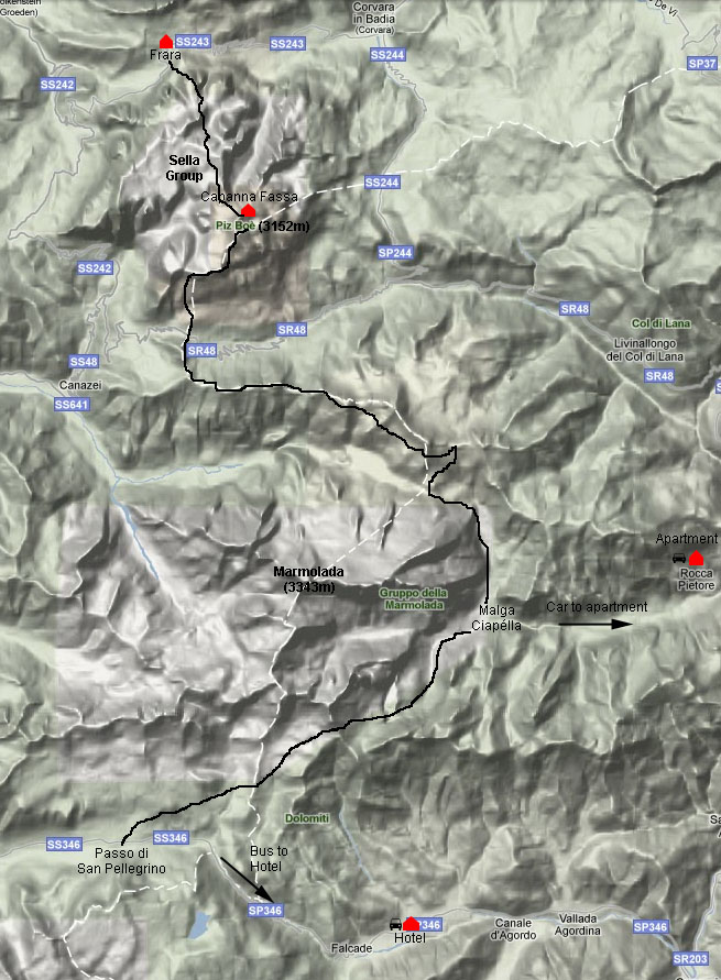 This stage took us 3 days. It passes through two major mountain groups of the Dolomites, the Sella Group and the Marmolada Massif. Unfortunately the Marmolada Massif is a formidable obstacle and the AV2 bypasses it completely with about 5km of walking along road 641. A variant from the main route does tackle the Marmolada Massif by crossing the Forcella de la Marmolada but this variant requires crampons. We did not have this equipment with us at this time so we took the standard AV2 route. However, later I returned to this area with all the required gear and tackled Marmolada itself via the Via Ferrata Marmolada and this I have written up on my via ferrata web page.