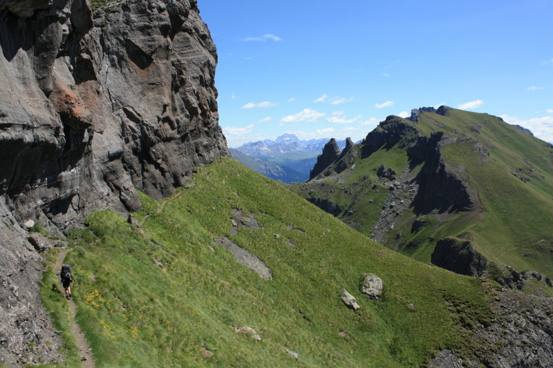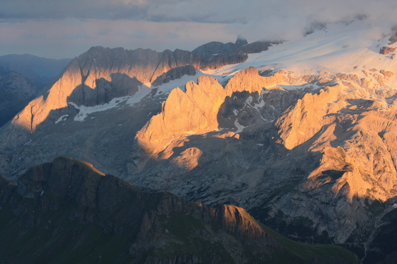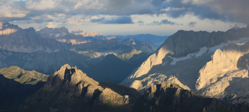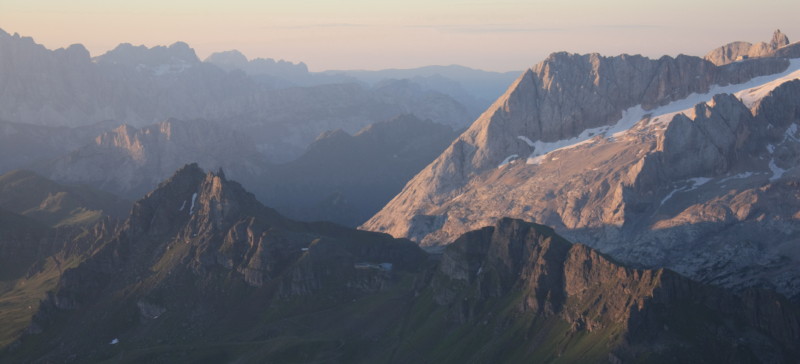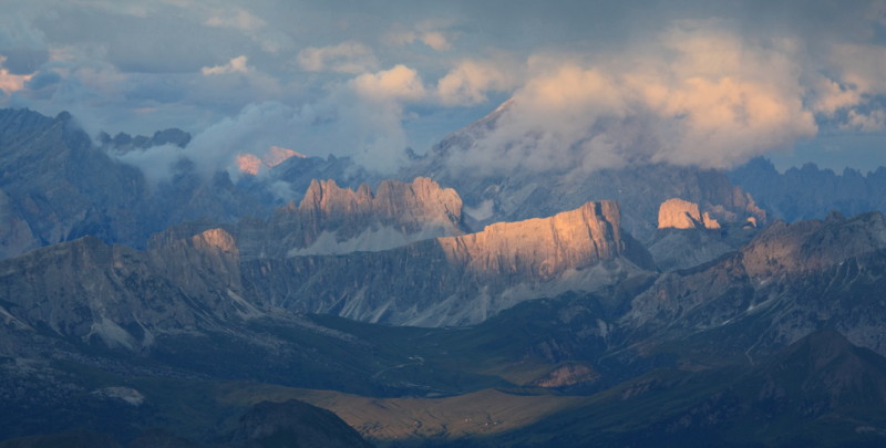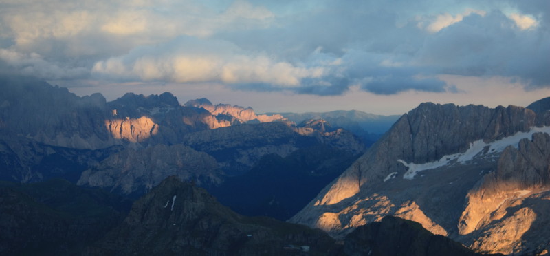 | 28 Jul 2010 | Beautiful sunrise from the summit of Piz Boè. A fine day, we descended to Passo Pordoi. Ridiculous throngs of people. We tried to avoid the crowds staying as high as possible on the ridgetops heading east above Lago di Fedaia. We then descended to Passo di Fedaia and walked down a ski run to Malga Ciapéla. The campground there was full but at the local store we met a lady who's mother had an apartment in a village a few kilometres down the road. We were driven to Rocca Piétore Ròcia and stayed in a lovely apartment in this beautiful little village. |