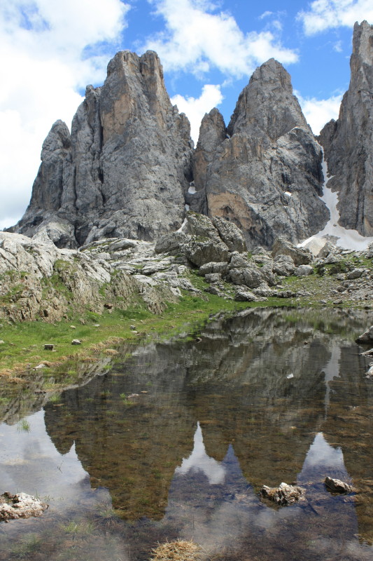 | 30 Jul 2010 | Early bus back to Passo di San Pellegrino from our hotel in Caviola. Fine day but with a little afternoon cloud and sleet. Route to Passo di Valles was uninteresting ski slope. But after Passo di Valles we entered spectacular country. Lunch on a grassy spot near Passo dei Fochet di Focobon. Climbed into rocky country to the stone hut Rifugio Mulaz (2571m). Late that afternoon we climbed Mt Mulaz (2906m). |