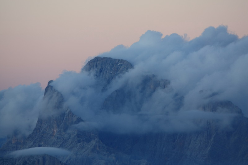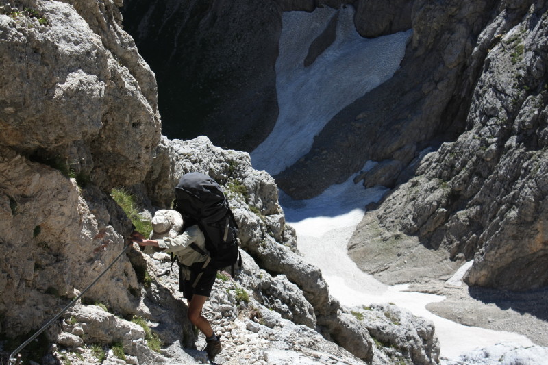 | 2 Aug 2010 | A day trip from Rifugio Treviso where we spent 2 nights. Headed up the Via Ferrata Fiamme Gialle which was very exciting without harnesses. Reached the spectacularly located Biv R. Reali (2595m) and then enjoyed spectacular ridge walking southwards to Forcella delle Mughe. Then a long descent back to Rifugio Treviso. Clouds starting to build. |
