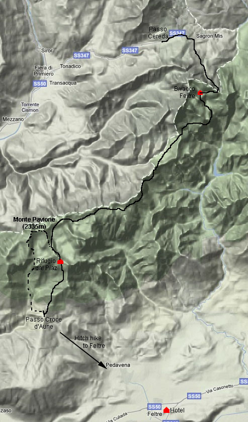 | 5 Aug 2010 | A very cloudy morning, worsening weather. Descended well graded WW1 historic path to Passo Croce d'Aune and quickly hitched a ride into Feltre. Lots of organising to do in Feltre. Got a train to Venezia Mestre where I picked up a rental car and drove back to Feltre. Stayed in a caravan at a small campsite a few kilometres outside Feltre. |