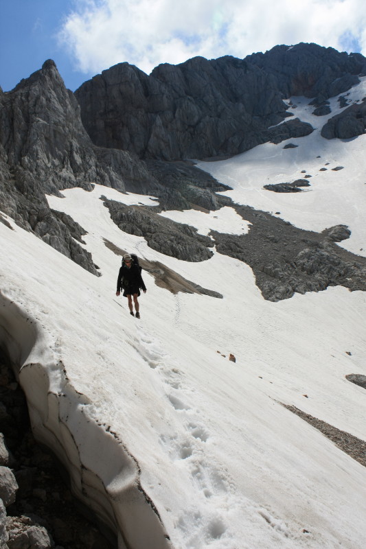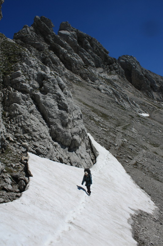 Because it was early in the season, snow still covered large sections of the trail on the high ground, and this presented an additional challenge. In some cases the snow still covered the protected sections of the route. This meant some steep snowdrifts had to be crossed without protection. An ice axe and crampons would have been very welcome at these rather precarious moments, but we were not carrying this equipment. At times it was necesary to deviate from the main route to avoid snow, and this occasionally led over potentially dangerous ground.
