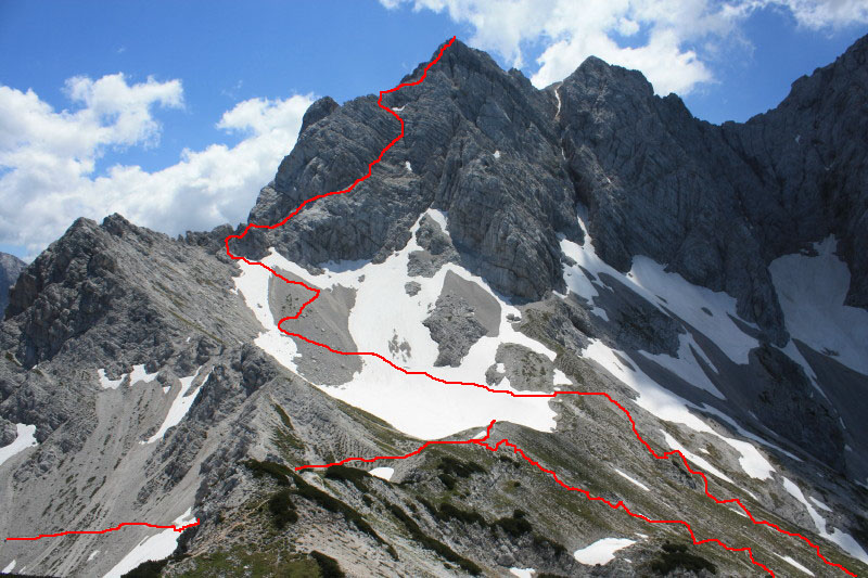 I have marked the route up Križ in this photo. From Kranjska koča we climbed back up to near Jezersko sedlo and then across the snowy bowl in this photo. Then it was up the scree slope to meet the cables, spikes and rungs which led up the exposed rock face to the summit. |