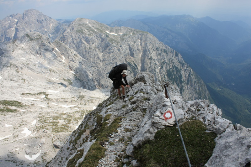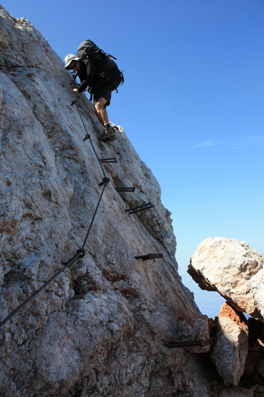 Earlier today we had climbed Grintovec (2558m) from Cojzova koča, a fairly easy uphill plod. The descent from Grintovec to Češka koča was a different story though, with some serious via ferrata sections like the one in this photo. |