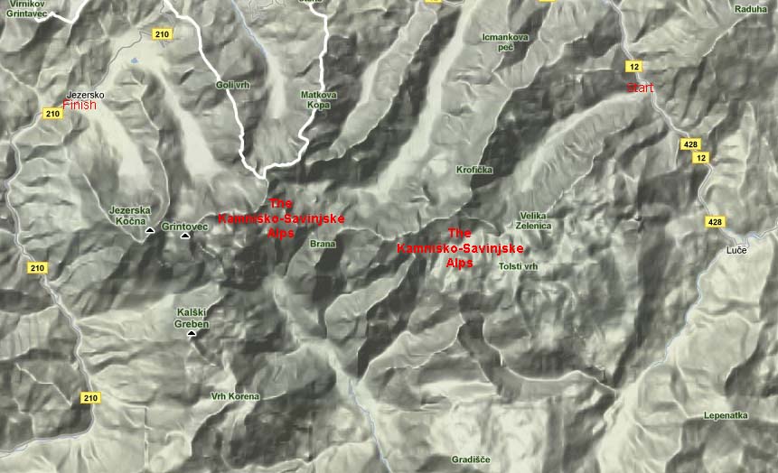 This is a true high mountain stage which, alongside Stage 6, would rank as the most challenging, spectacular and demanding stage of the entire route. On the map above I make no attempt to trace the exact route because it winds back and forth through the mountains in a very convoluted manner in order to reach the summit of every peak possible in the rugged Kamniško-Savinjske range. Over a period of 6 days we climbed 11 peaks in this range and many of these would be completely unclimbable were it not for the steel cables, spikes and rungs (via ferrate) that are provided for protection. It would be highly advisable to carry a harness and via ferrata kit on this stage of the trek although I did not use mine. In the absence of a via ferrata kit, a sling and two carabiners would suffice as a bare minimum.