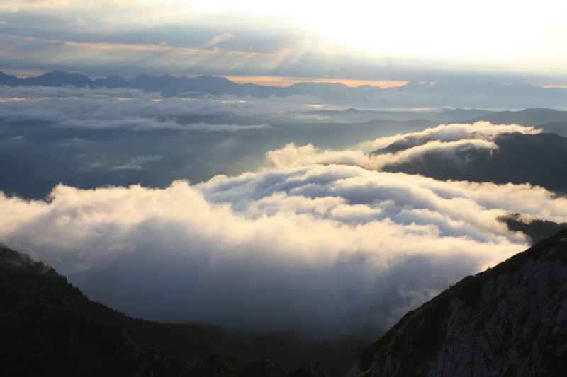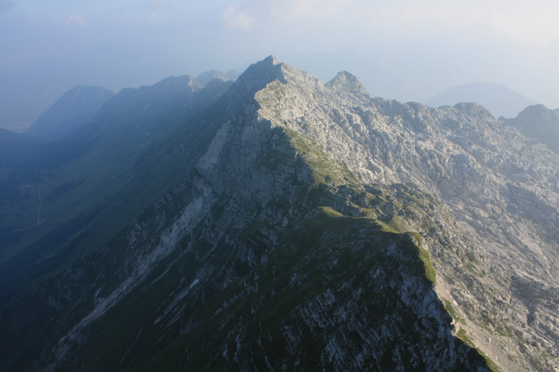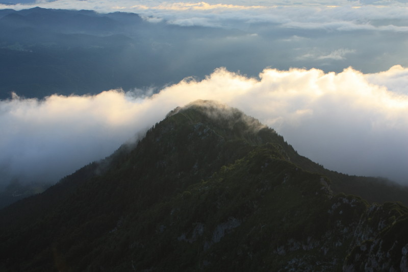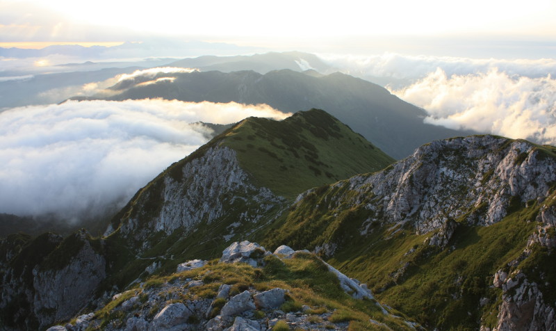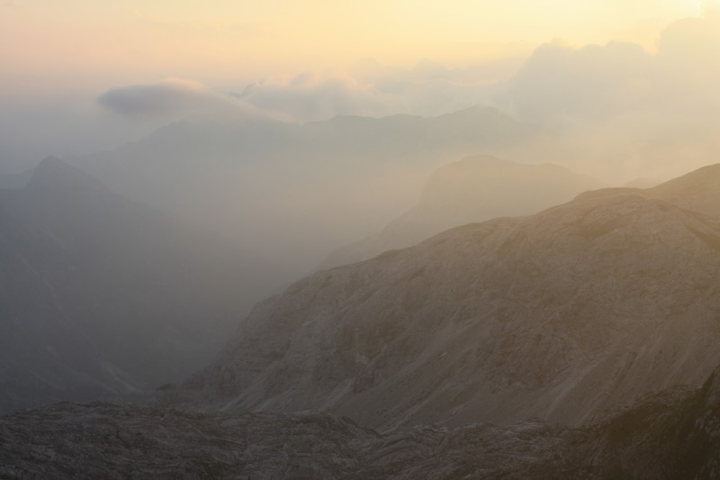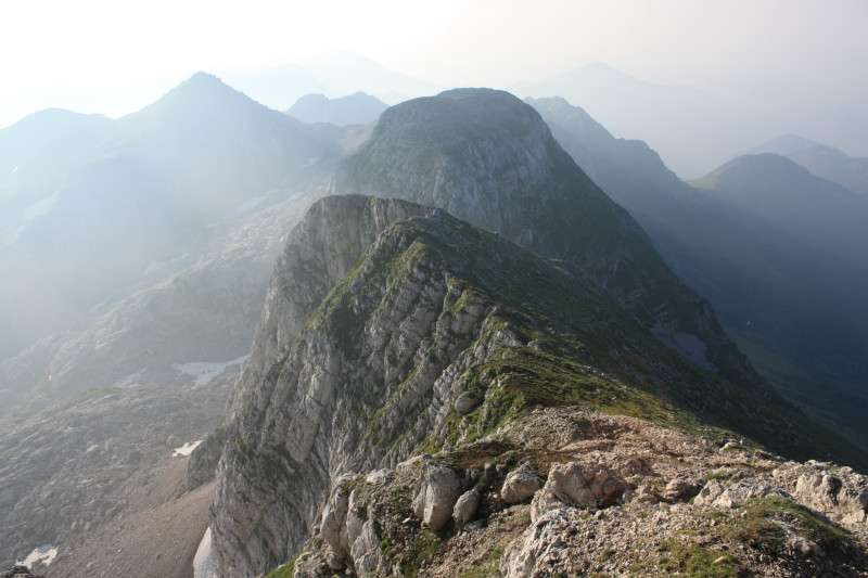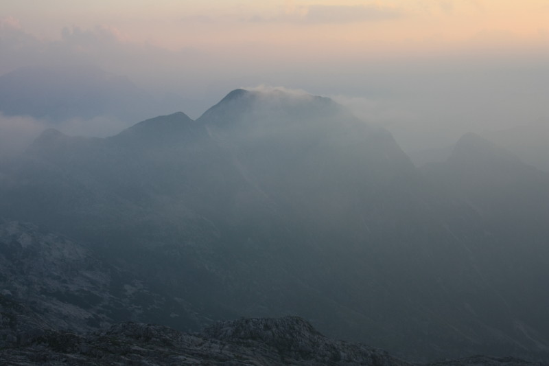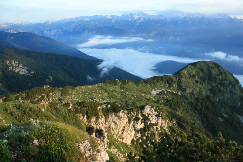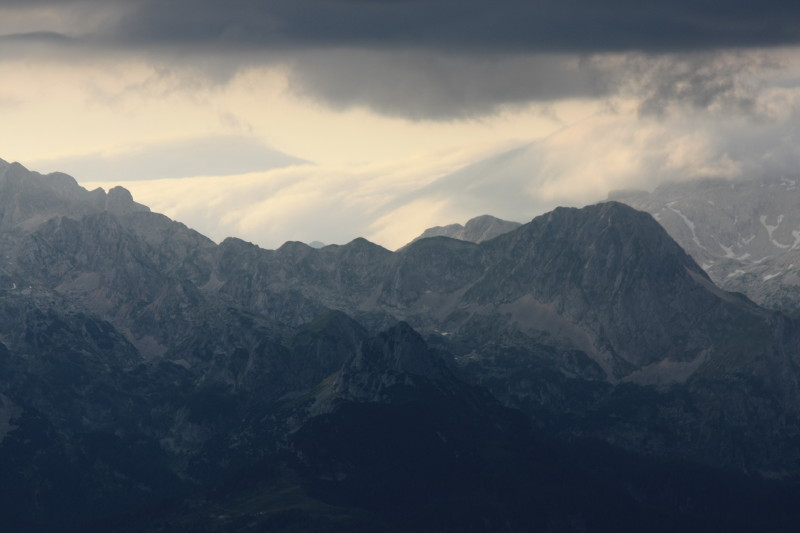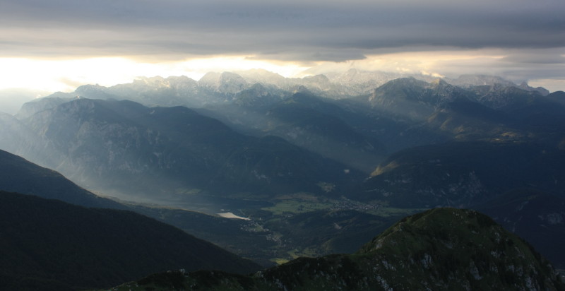 | 18 Jul 2010 | The first day of really bad weather on the whole trip. Strong wind, low cloud and periods of rain. Traversed the top of the mountain range to its south-eastern extremity at Črna Prst. Climbed the peaks of Vogel (1922m) and Rodica (1966m) on the way. Spectacular despite the bad weather. Reached Dom Zorka Jelnčiča on the summit of Črna Prst (1844m) . Improving weather for dramatic sunset photos. |