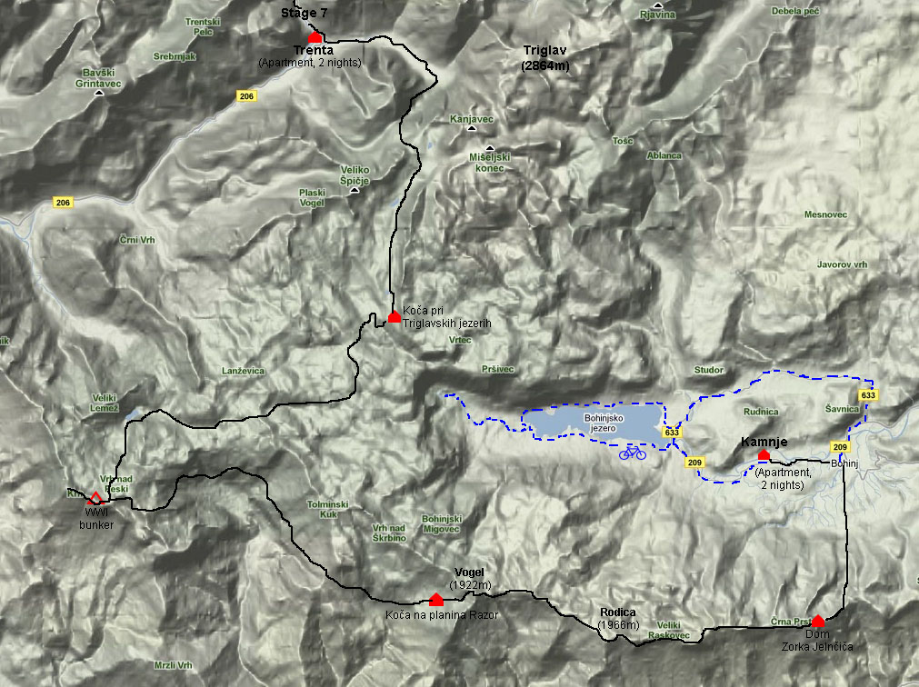 It took us four days to trek from Trenta to Črna Prst, the terminal peak of the southern Julian Alps. It was here that we departed from the official route for the last time. Here the route turns southwards and exits the mountains at the pass of Petrovo Brdo where Stage 8 ends. For us it served no purpose to go to Petrovo Brdo so from Črna Prst we turned north instead of south, and concluded our trek in the town of Bohinjska Bistrica. Here we had a spare day to hire bikes and enjoy this picturesque valley and its beautiful lake Bohinjsko Jezero.