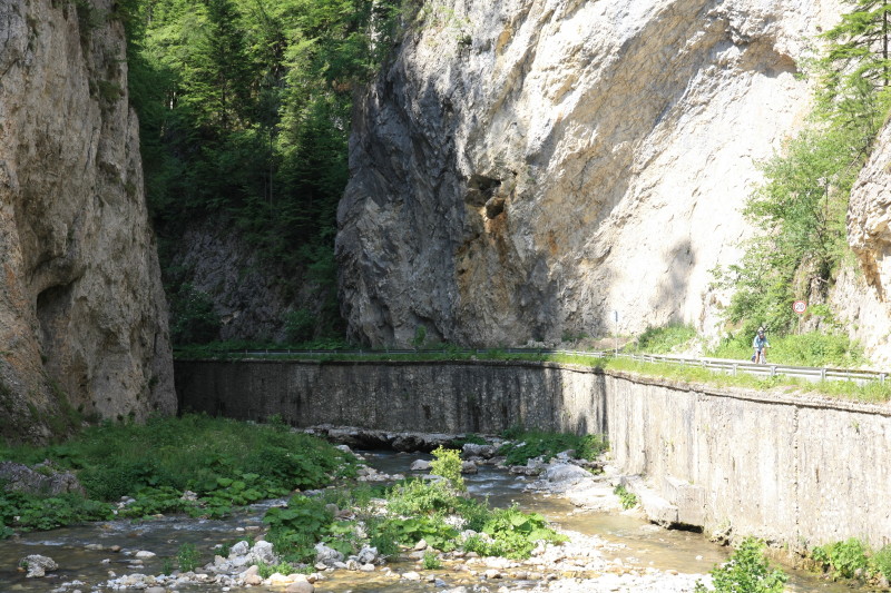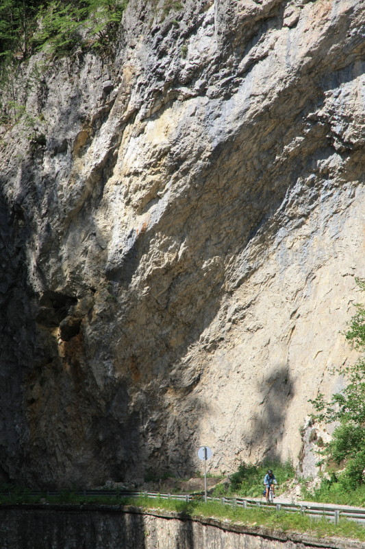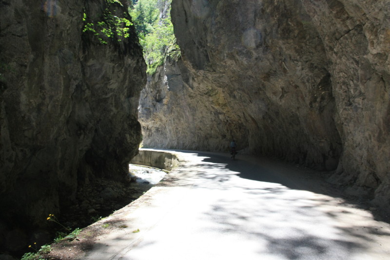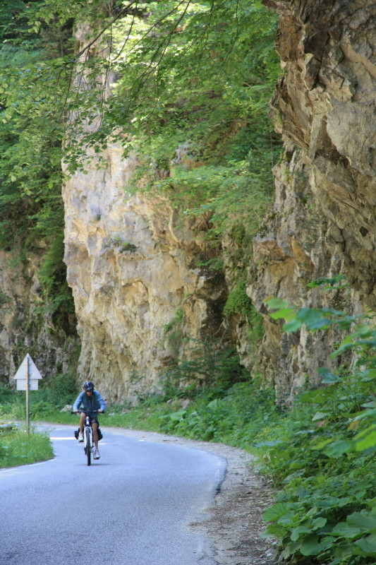 | 17 Jun 2013 | A hot sunny day with cave tours to break up the riding. Lovely rural countryside and traditional farm people. Long steep descent into deep limestone valley and a spectacular ride up a side valley to Jagodina Cave. The spectacular ride on this little road was more interesting than the cave tour itself. Cycled back down the valley and then continued east for a short while and then climbed steeply up another side valley through more limestone country. Tunnels and narrow steep roads eventually led to a huge limestone formation called Devils Throat. Continued uphill to the tiny village of Trigrad where we again had trouble finding our accommodation but were eventually comfortably settled in a farmhouse. | Farmhouse in Trigrad. |