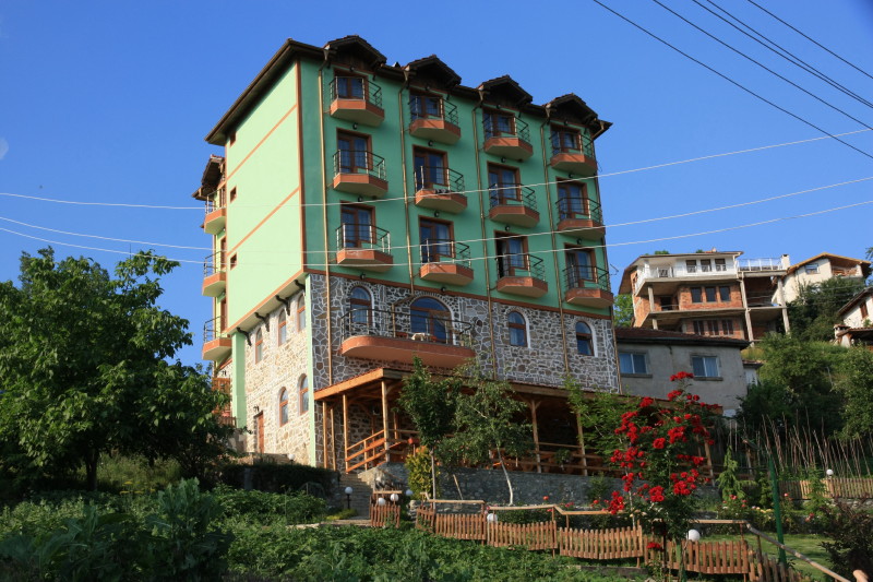 | 19 Jun 2013 | Hot day. Back uphill again, taking the route to Pamporono, a ski centre at 1650m. There followed forested riding, another high pass at 1700m before finally a huge 20km downhill run into Laki at about 800m. We took a minor side road that climbed very steeply in switchbacks to the tiny village of Borovo perched on a high terrace at 1100m. A seemingly oversized hotel was our accommodation in this tiny village. | Hotal in Borovo. |