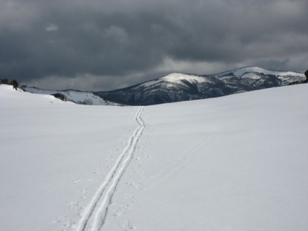 | Making tracks. After parting with Jiri and Catherine I headed up solo onto Kerries Ridge. Here there were no other ski tracks apart from my own, and the views of the Greymare Range under darkening skies was dramatic. | ||