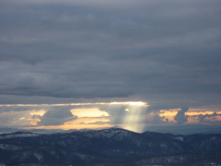 | I finally reached the top of Jagungal at 4:50pm on Saturday afternoon and wisps of cloud were threading themselves around the summit. But to the west, shafts of sunlight penetrated through gaps in the cloud. | ||