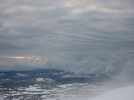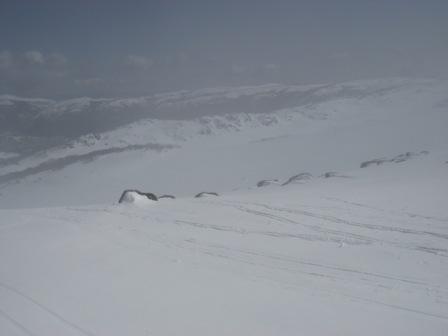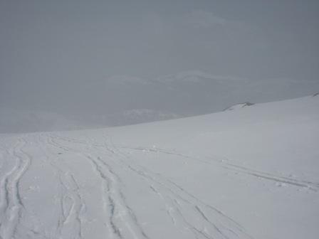 | Until I reached Gungartan Pass, I was skiing in whiteout. Only when I reached Gungartan Pass did the whiteout begin to dissipate, and here the first translucent scenes of a sunny day beyond the cloud were seen. | ||