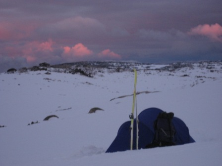 | After skiing down from the summit I pitched my tent as the sky lit up in the setting sun. | ||