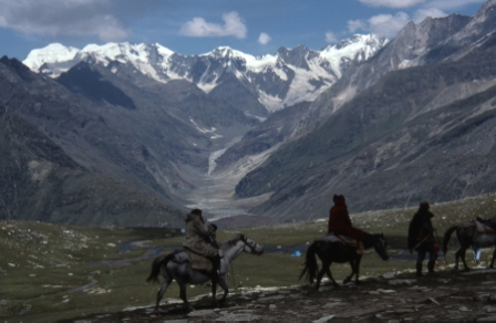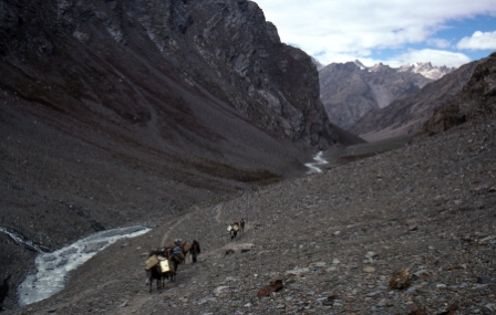Day 2 - 20 Aug 1999 Our mules coming up the valley towards Shingo La. Here we look back down the valley that we had been climbing up. The altitude of Shingo La is about 5100m. |