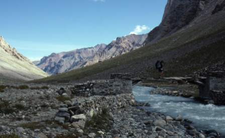 Day 2 - 20 Aug 1999 We crossed this bridge and then climbed steeply up to Shingo La base camp where we camped that night. We climbed over Shingo La on the following day, 21 August. |