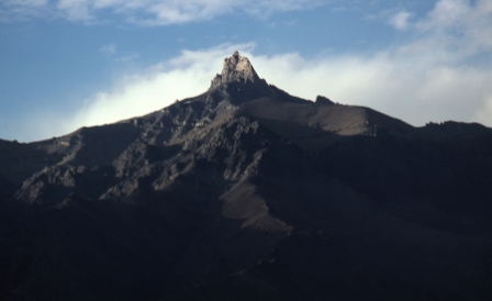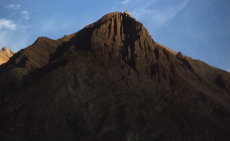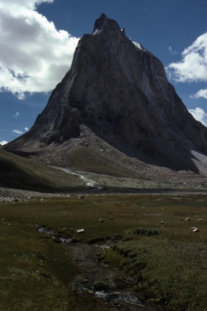 Day 4 - 22 Aug 1999 After Shingo La we descended a wide grassy valley and out of this valley rises this collosus of rock. This feature dominated the scenery for the day after crossing Shingo La. |